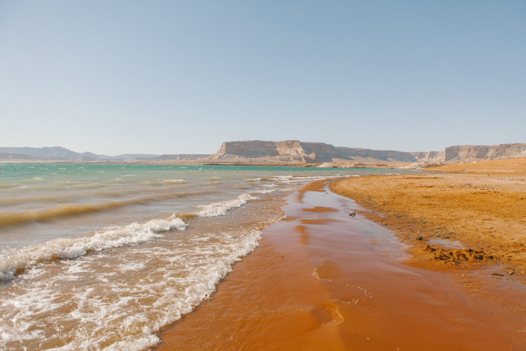 The lake has sheer red and orange cliffs and natural formations such as bridges and arches. The lake also has 100 side canyons that people can explore.