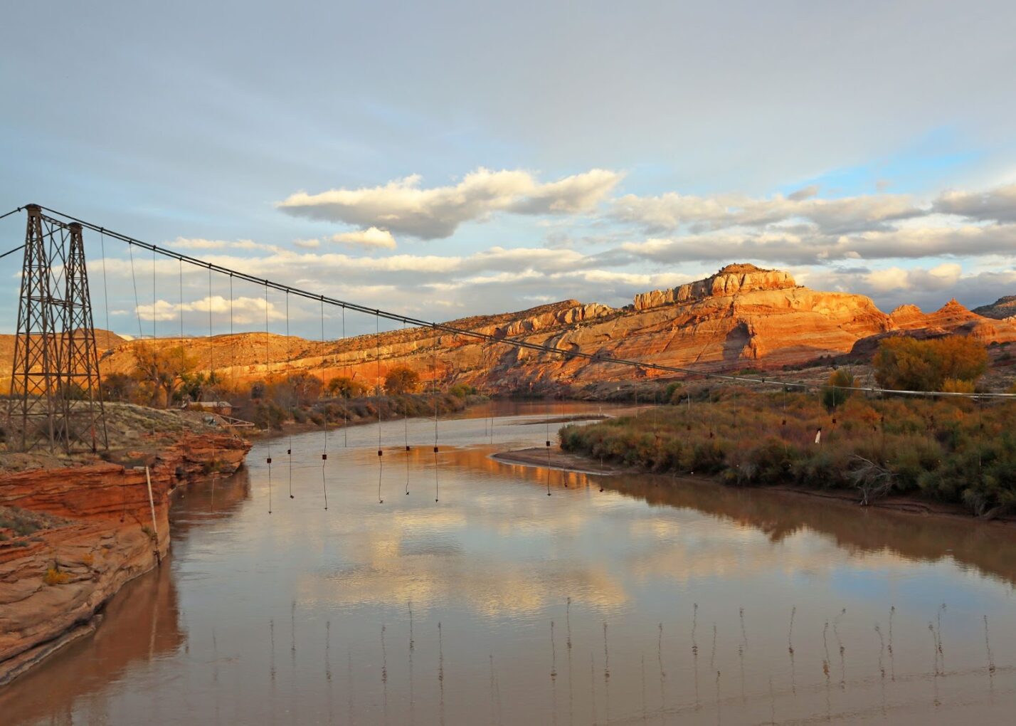 The original bridge had an all wood deck. It was burnt down in 2008 by a brush fire that was started by a little boy who was playing with matches. The bridge wasn’t rebuilt and a new bridge crosses over the Colorado River today.