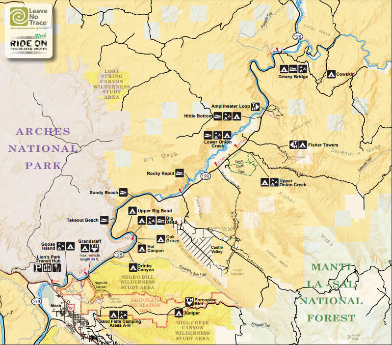 There are numerous places that you can camp along UT 128 Scenic Byway. Most of the places are run by the Bureau of Land Management.