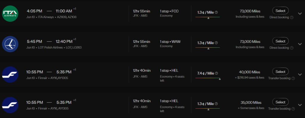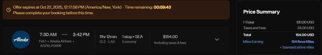 Once you select a destination, Rove will show you the different flights that you can book. They will also show you if the booking is a transfer booking or if the booking is a direct booking. They also show you the cents per point that you’ll receive for the flight.