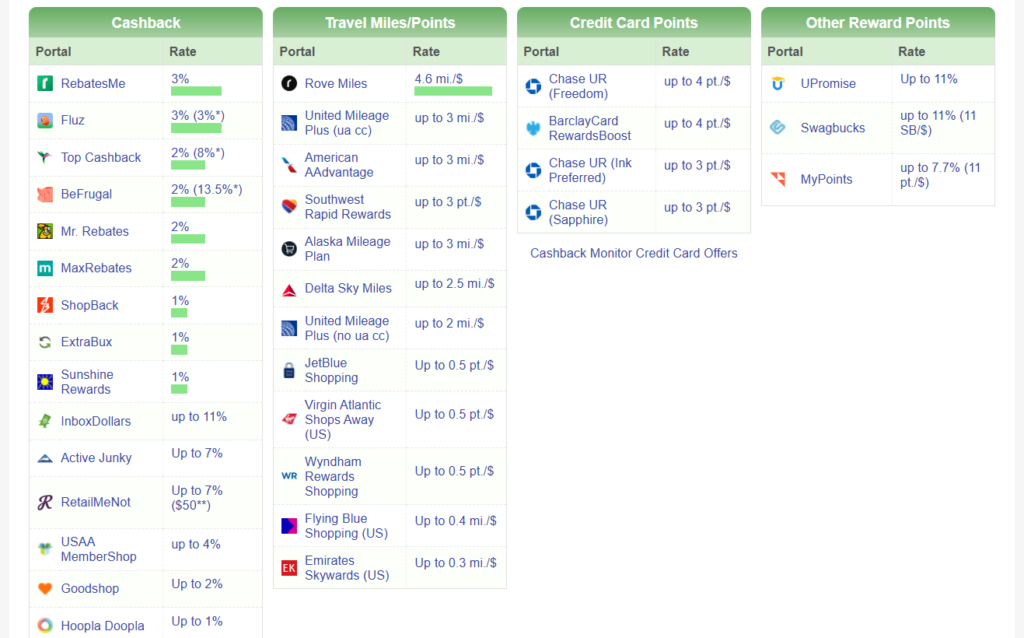 If you like to use shopping portals to earn money or points, a good site to checkout before making a purchase is Cashback Monitor. Cashback Monitor shows you the highest earning rates for shopping cashback portals, travel miles/points, credit card points, and other reward programs.